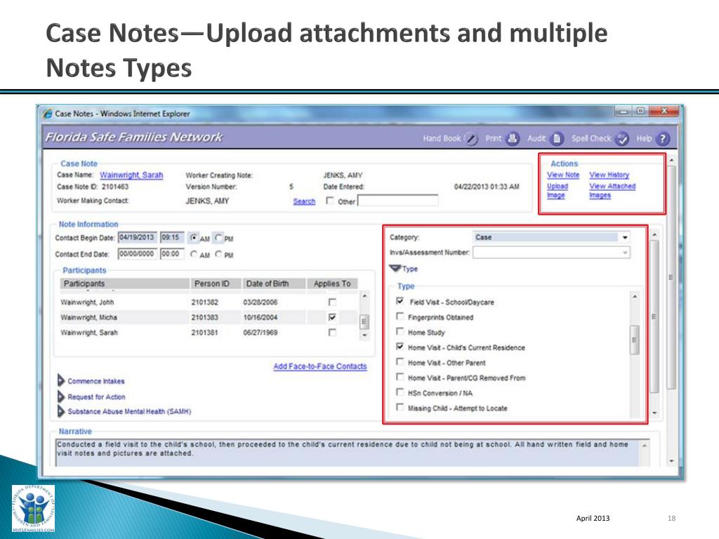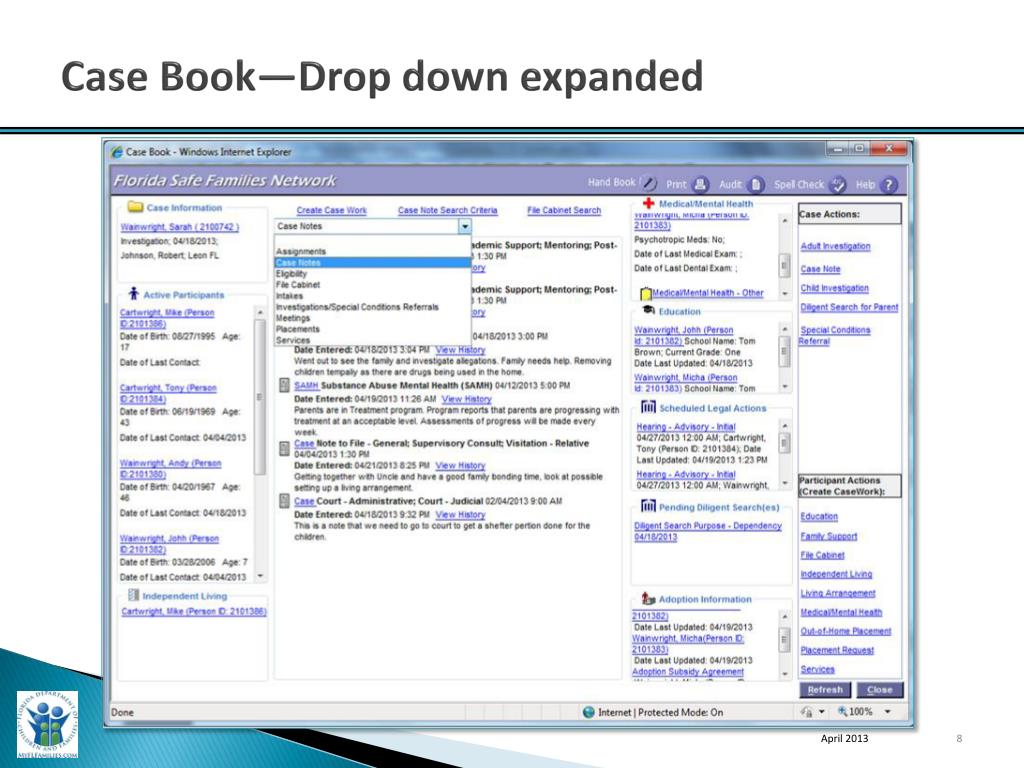 Overview of key new capabilities • My Tasks Calendar • Desktop—Case View and Participant ViewCase Book and Person Book links • Case Book—Drop down expanded • Create Case Work from Case Book • Person Book—Placements • Utility Search Page Results—Case; Person; Provider and Worker TabsCase Book and Person Book links (where applicable) • Meetings • Case Notes—Upload attachments and multiple Notes Types • Case Notes & Meeting—Upload image and view attached images • Case Notes—Substance Abuse Integration (FIS) Workers Feedback Loop • Imaging Page—“Other” • File Cabinet Search—Results April 2013