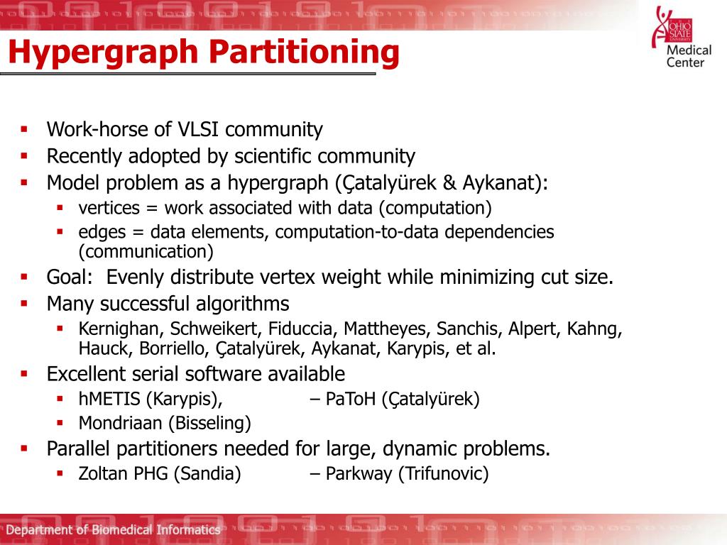 Hypergraph Partitioning • Work-horse of VLSI community • Recently adopted by scientific community • Model problem as a hypergraph (Çatalyürek & Aykanat): • vertices = work associated with data (computation) • edges = data elements, computation-to-data dependencies (communication) • Goal: Evenly distribute vertex weight while minimizing cut size. • Many successful algorithms • Kernighan, Schweikert, Fiduccia, Mattheyes, Sanchis, Alpert, Kahng, Hauck, Borriello, Çatalyürek, Aykanat, Karypis, et al. • Excellent serial software available • hMETIS (Karypis), – PaToH (Çatalyürek) • Mondriaan (Bisseling) • Parallel partitioners needed for large, dynamic problems. • Zoltan PHG (Sandia) – Parkway (Trifunovic)
