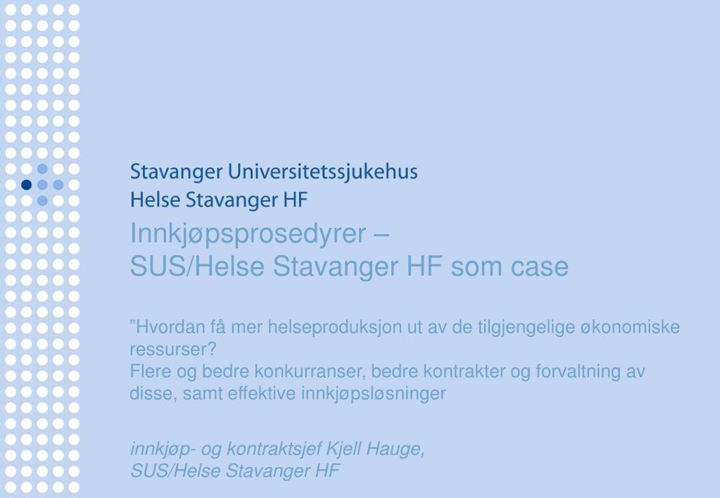 Innkjøpsprosedyrer – SUS/Helse Stavanger HF som case”Hvordan få mer helseproduksjon ut av de tilgjengelige økonomiske ressurser?Flere og bedre konkurranser, bedre kontrakter og forvaltning av disse, samt effektive innkjøpsløsningerinnkjøp- og kontraktsjef Kjell Hauge, SUS/Helse Stavanger HF