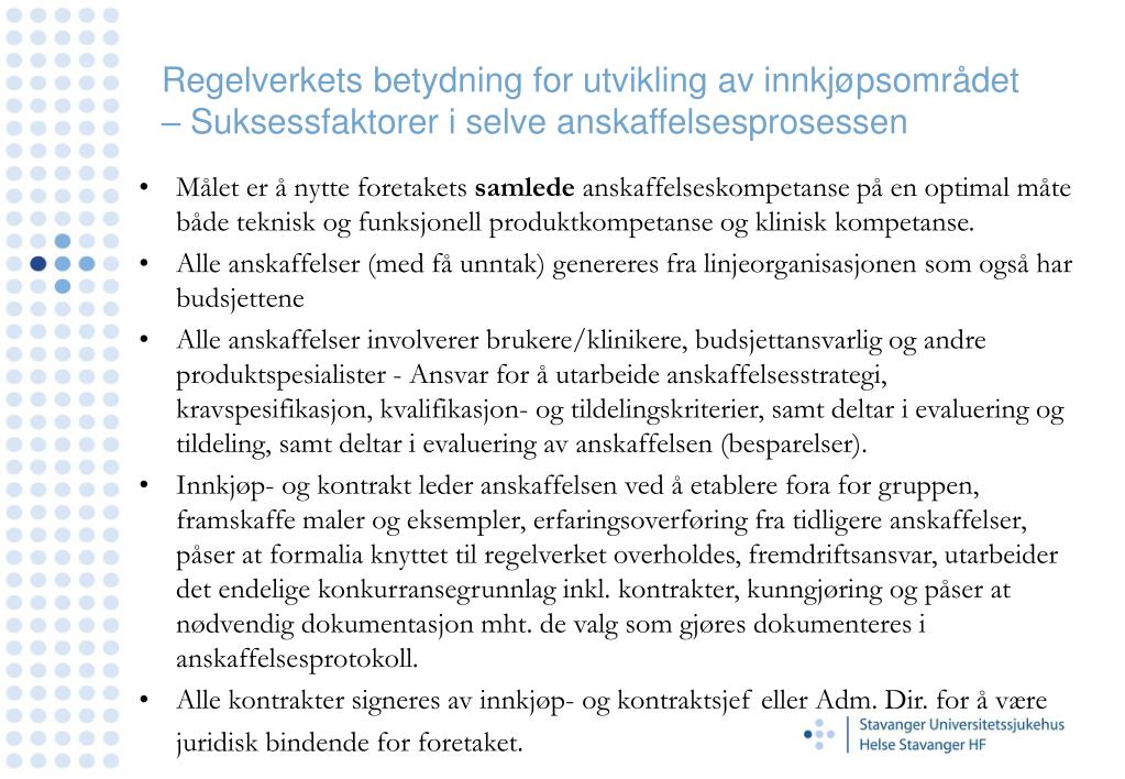 Regelverkets betydning for utvikling av innkjøpsområdet – Suksessfaktorer i selve anskaffelsesprosessen • Målet er å nytte foretakets samlede anskaffelseskompetanse på en optimal måte både teknisk og funksjonell produktkompetanse og klinisk kompetanse. • Alle anskaffelser (med få unntak) genereres fra linjeorganisasjonen som også har budsjettene • Alle anskaffelser involverer brukere/klinikere, budsjettansvarlig og andre produktspesialister - Ansvar for å utarbeide anskaffelsesstrategi, kravspesifikasjon, kvalifikasjon- og tildelingskriterier, samt deltar i evaluering og tildeling, samt deltar i evaluering av anskaffelsen (besparelser). • Innkjøp- og kontrakt leder anskaffelsen ved å etablere fora for gruppen, framskaffe maler og eksempler, erfaringsoverføring fra tidligere anskaffelser, påser at formalia knyttet til regelverket overholdes, fremdriftsansvar, utarbeider det endelige konkurransegrunnlag inkl. kontrakter, kunngjøring og påser at nødvendig dokumentasjon mht. de valg som gjøres dokumenteres i anskaffelsesprotokoll. • Alle kontrakter signeres av innkjøp- og kontraktsjef eller Adm. Dir. for å være juridisk bindende for foretaket.