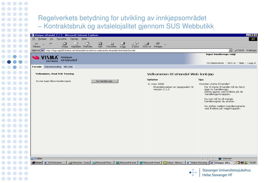 Regelverkets betydning for utvikling av innkjøpsområdet i foretaket og i regionen • All spesialisthelsetjeneste i Sør-Rogaland - somatisk og psykiatrisk: Lokalisert i Stavanger (Våland) og Egersund samt ambulansestasjoner og DPS er over hele sørfylke • Årlig anskaffelsesbudsjett litt over 1000 mill, ca 5200 ansatte • Ca 2600 leverandører aktive pr. år • 50 leverandører som leverer for over 5 mill. pr. år - ca 400 over 200 000 pr. år • Inngår ca 110 kontrakter årlig, og har i drift ca 250 rammeavtaler i drift • Antallet anskaffelser er ca 100 i året, og HFet deltar i innkjøpssamarbeid i ca 10-15 anskaffelser i året • Antall registrerte bestillinger; ca 13 500 pr. år. Alle bestillinger fra HS skal ha bestillingsnummer • Mottar mellom 50-60 000 faktura pr. år