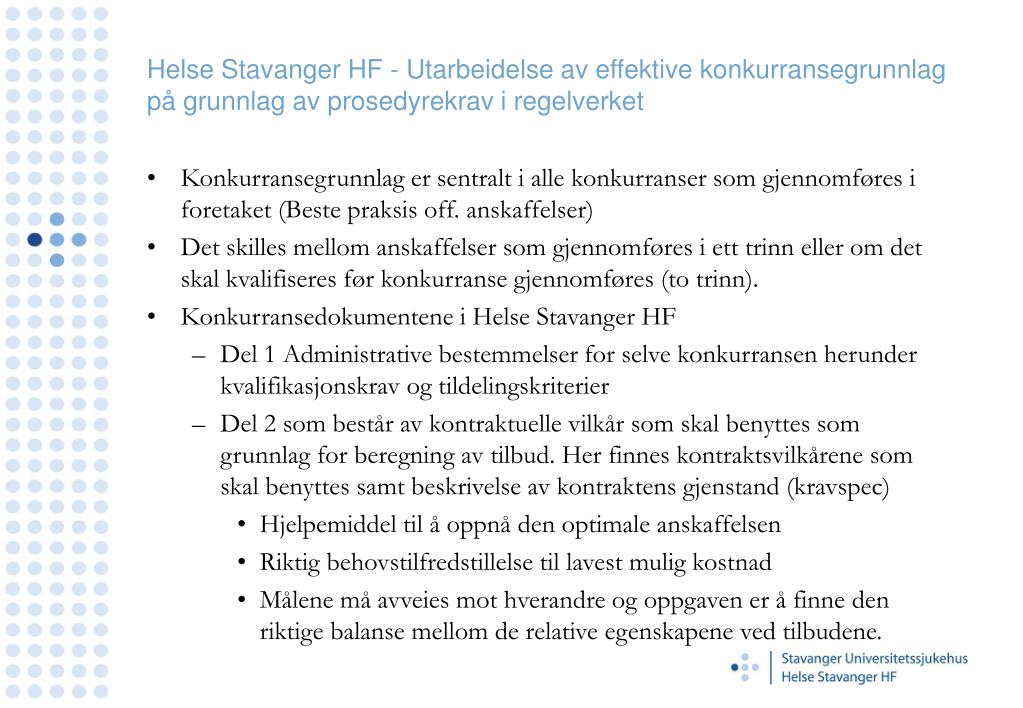 Helse Stavanger HF - Utarbeidelse av effektive konkurransegrunnlag på grunnlag av prosedyrekrav i regelverket • Konkurransegrunnlag er sentralt i alle konkurranser som gjennomføres i foretaket (Beste praksis off. anskaffelser) • Det skilles mellom anskaffelser som gjennomføres i ett trinn eller om det skal kvalifiseres før konkurranse gjennomføres (to trinn). • Konkurransedokumentene i Helse Stavanger HF • Del 1 Administrative bestemmelser for selve konkurransen herunder kvalifikasjonskrav og tildelingskriterier • Del 2 som består av kontraktuelle vilkår som skal benyttes som grunnlag for beregning av tilbud. Her finnes kontraktsvilkårene som skal benyttes samt beskrivelse av kontraktens gjenstand (kravspec) • Hjelpemiddel til å oppnå den optimale anskaffelsen • Riktig behovstilfredstillelse til lavest mulig kostnad • Målene må avveies mot hverandre og oppgaven er å finne den riktige balanse mellom de relative egenskapene ved tilbudene.
