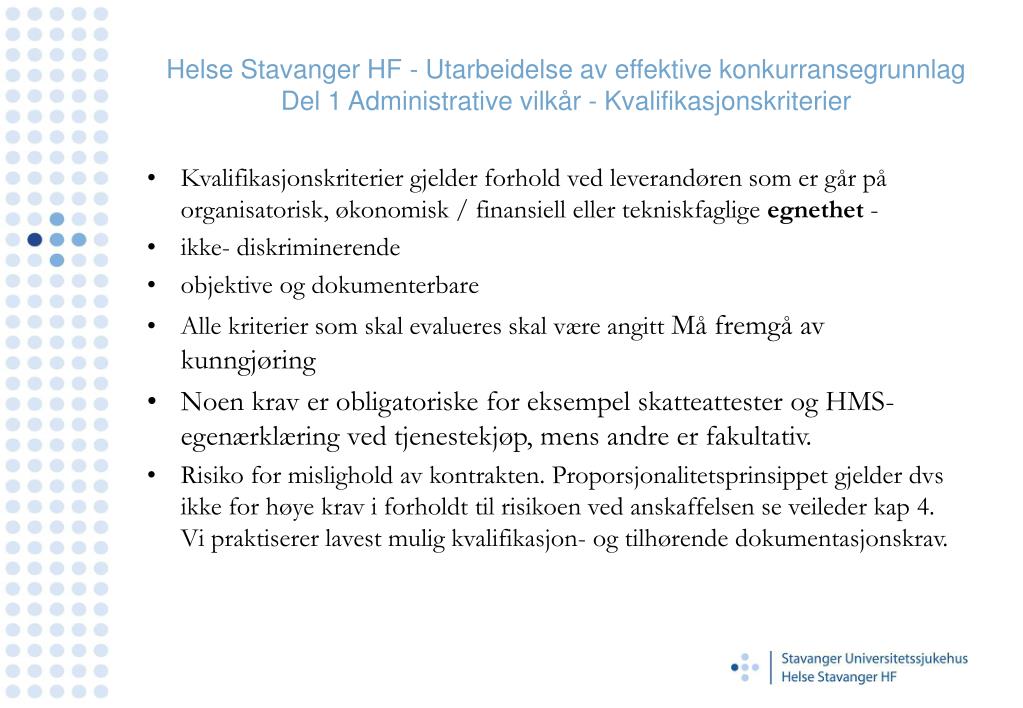 Helse Stavanger HF - Utarbeidelse av effektive konkurransegrunnlag Del 1 Administrative vilkår - Kvalifikasjonskriterier • Kvalifikasjonskriterier gjelder forhold ved leverandøren som er går på organisatorisk, økonomisk / finansiell eller tekniskfaglige egnethet - • ikke- diskriminerende • objektive og dokumenterbare • Alle kriterier som skal evalueres skal være angitt Må fremgå av kunngjøring • Noen krav er obligatoriske for eksempel skatteattester og HMS-egenærklæring ved tjenestekjøp, mens andre er fakultativ. • Risiko for mislighold av kontrakten. Proporsjonalitetsprinsippet gjelder dvs ikke for høye krav i forholdt til risikoen ved anskaffelsen se veileder kap 4. Vi praktiserer lavest mulig kvalifikasjon- og tilhørende dokumentasjonskrav.