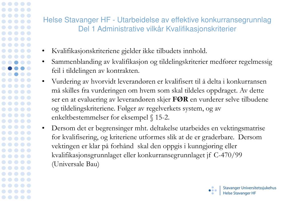 Helse Stavanger HF - Utarbeidelse av effektive konkurransegrunnlag Del 1 Administrative vilkår Kvalifikasjonskriterier • Kvalifikasjonskriteriene gjelder ikke tilbudets innhold. • Sammenblanding av kvalifikasjon og tildelingskriterier medfører regelmessig feil i tildelingen av kontrakten. • Vurdering av hvorvidt leverandøren er kvalifisert til å delta i konkurransen må skilles fra vurderingen om hvem som skal tildeles oppdraget. Av dette ser en at evaluering av leverandøren skjer FØR en vurderer selve tilbudene og tildelingskriteriene. Følger av regelverkets system, og av enkeltbestemmelser for eksempel § 15-2. • Dersom det er begrensinger mht. deltakelse utarbeides en vektingsmatrise for kvalifisering, og kriteriene utformes slik at de er graderbare. Dersom vektingen er klar på forhånd skal den oppgis i kunngjøring eller kvalifikasjonsgrunnlaget eller konkurransegrunnlaget jf C-470/99 (Universale Bau)