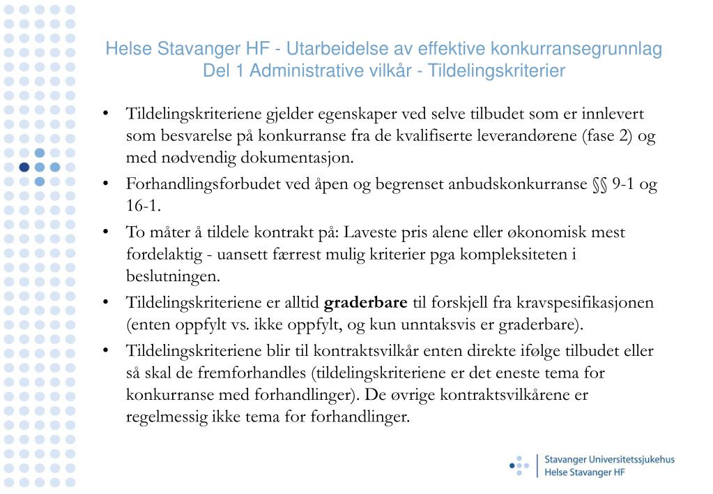 Helse Stavanger HF - Utarbeidelse av effektive konkurransegrunnlag Del 1 Administrative vilkår - Tildelingskriterier • Tildelingskriteriene gjelder egenskaper ved selve tilbudet som er innlevert som besvarelse på konkurranse fra de kvalifiserte leverandørene (fase 2) og med nødvendig dokumentasjon. • Forhandlingsforbudet ved åpen og begrenset anbudskonkurranse §§ 9-1 og 16-1. • To måter å tildele kontrakt på: Laveste pris alene eller økonomisk mest fordelaktig - uansett færrest mulig kriterier pga kompleksiteten i beslutningen. • Tildelingskriteriene er alltid graderbare til forskjell fra kravspesifikasjonen (enten oppfylt vs. ikke oppfylt, og kun unntaksvis er graderbare). • Tildelingskriteriene blir til kontraktsvilkår enten direkte ifølge tilbudet eller så skal de fremforhandles (tildelingskriteriene er det eneste tema for konkurranse med forhandlinger). De øvrige kontraktsvilkårene er regelmessig ikke tema for forhandlinger.