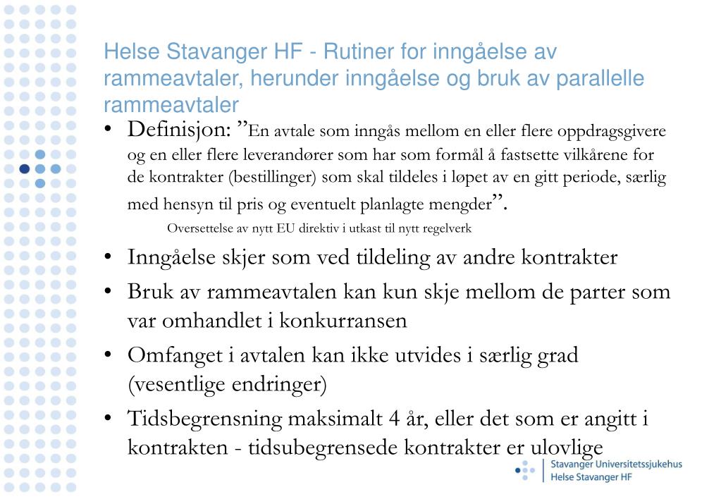 Helse Stavanger HF - Rutiner for inngåelse av rammeavtaler, herunder inngåelse og bruk av parallelle rammeavtaler • Definisjon: ”En avtale som inngås mellom en eller flere oppdragsgivere og en eller flere leverandører som har som formål å fastsette vilkårene for de kontrakter (bestillinger) som skal tildeles i løpet av en gitt periode, særlig med hensyn til pris og eventuelt planlagte mengder”. Oversettelse av nytt EU direktiv i utkast til nytt regelverk • Inngåelse skjer som ved tildeling av andre kontrakter • Bruk av rammeavtalen kan kun skje mellom de parter som var omhandlet i konkurransen • Omfanget i avtalen kan ikke utvides i særlig grad (vesentlige endringer) • Tidsbegrensning maksimalt 4 år, eller det som er angitt i kontrakten - tidsubegrensede kontrakter er ulovlige