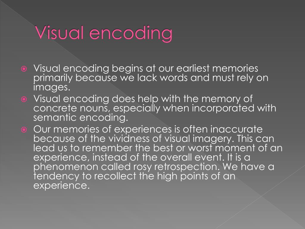 Visual encoding • Visual encoding begins at our earliest memories primarily because we lack words and must rely on images. • Visual encoding does help with the memory of concrete nouns, especially when incorporated with semantic encoding. • Our memories of experiences is often inaccurate because of the vividness of visual imagery. This can lead us to remember the best or worst moment of an experience, instead of the overall event. It is a phenomenon called rosy retrospection. We have a tendency to recollect the high points of an experience.
