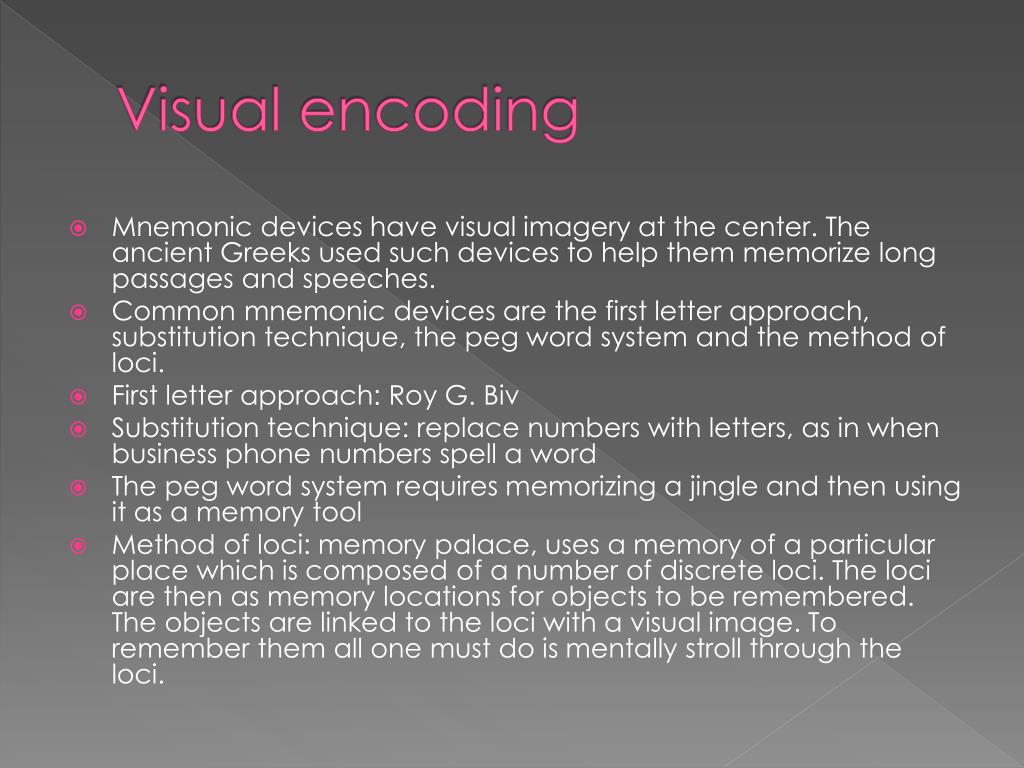 Visual encoding • Mnemonic devices have visual imagery at the center. The ancient Greeks used such devices to help them memorize long passages and speeches. • Common mnemonic devices are the first letter approach, substitution technique, the peg word system and the method of loci. • First letter approach: Roy G. Biv • Substitution technique: replace numbers with letters, as in when business phone numbers spell a word • The peg word system requires memorizing a jingle and then using it as a memory tool • Method of loci: memory palace, uses a memory of a particular place which is composed of a number of discrete loci. The loci are then as memory locations for objects to be remembered. The objects are linked to the loci with a visual image. To remember them all one must do is mentally stroll through the loci.