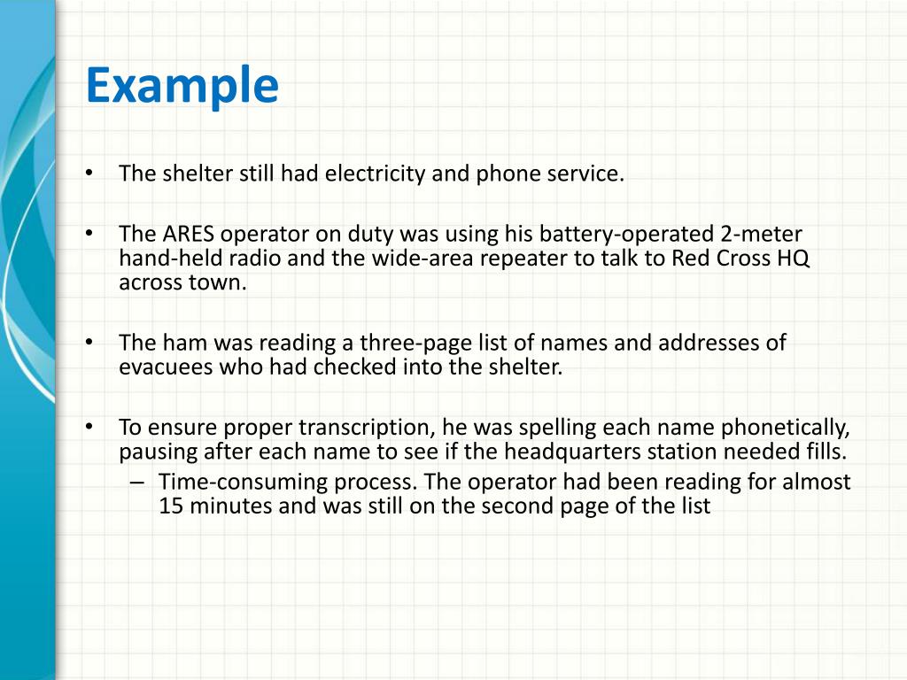 Example • The shelter still had electricity and phone service. • The ARES operator on duty was using his battery-operated 2-meter hand-held radio and the wide-area repeater to talk to Red Cross HQ across town. • The ham was reading a three-page list of names and addresses of evacuees who had checked into the shelter. • To ensure proper transcription, he was spelling each name phonetically, pausing after each name to see if the headquarters station needed fills. • Time-consuming process. The operator had been reading for almost 15 minutes and was still on the second page of the list