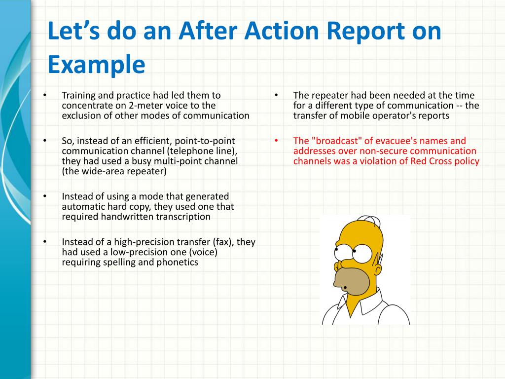 Training and practice had led them to concentrate on 2-meter voice to the exclusion of other modes of communication So, instead of an efficient, point-to-point communication channel (telephone line), they had used a busy multi-point channel (the wide-area repeater) Instead of using a mode that generated automatic hard copy, they used one that required handwritten transcription Instead of a high-precision transfer (fax), they had used a low-precision one (voice) requiring spelling and phonetics The repeater had been needed at the time for a different type of communication -- the transfer of mobile operator's reports The "broadcast" of evacuee's names and addresses over non-secure communication channels was a violation of Red Cross policy Let’s do an After Action Report on Example