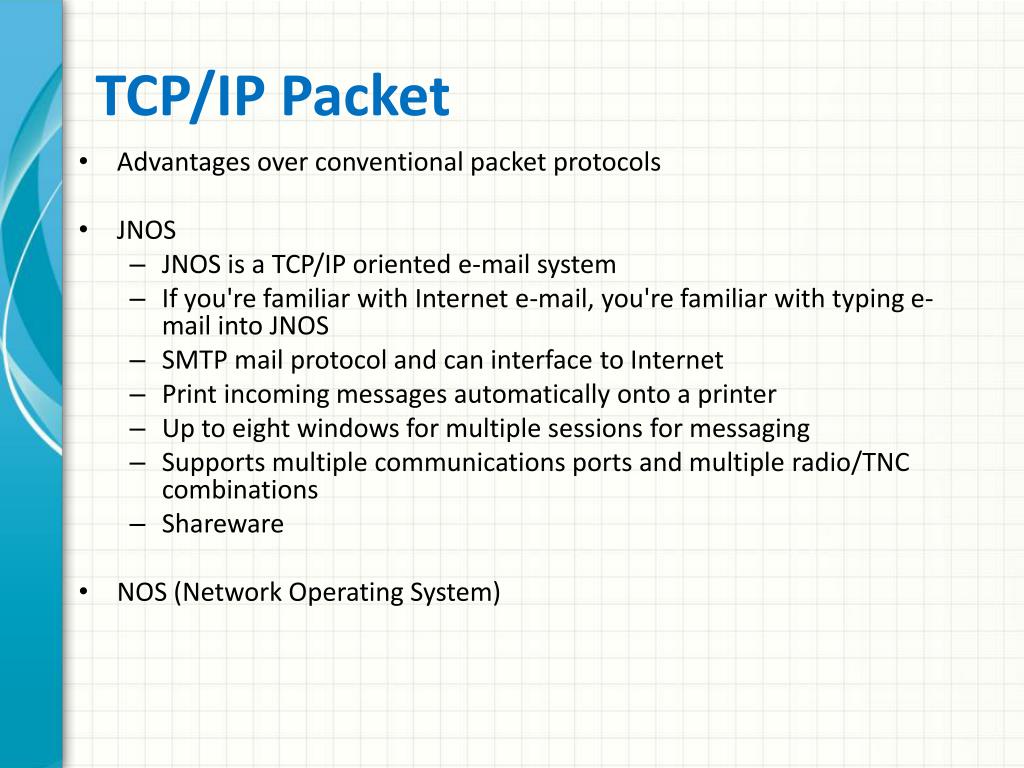 TCP/IP Packet • Advantages over conventional packet protocols • JNOS • JNOS is a TCP/IP oriented e-mail system • If you're familiar with Internet e-mail, you're familiar with typing e-mail into JNOS • SMTP mail protocol and can interface to Internet • Print incoming messages automatically onto a printer • Up to eight windows for multiple sessions for messaging • Supports multiple communications ports and multiple radio/TNC combinations • Shareware • NOS (Network Operating System)