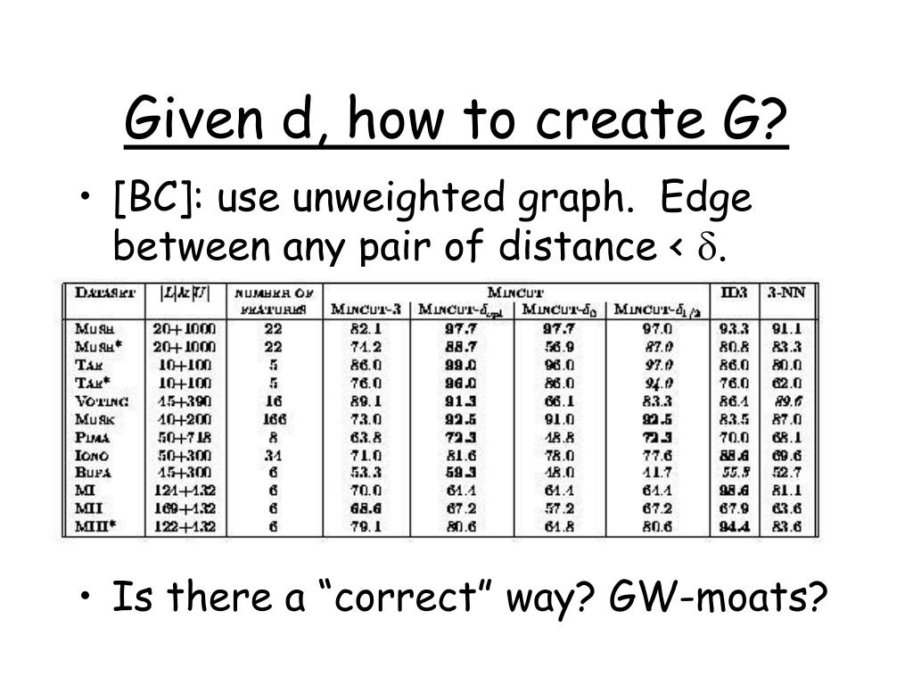 Given d, how to create G? • [BC]: use unweighted graph. Edge between any pair of distance < d. • Is there a “correct” way? GW-moats?