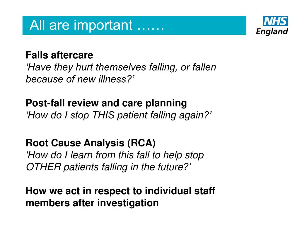 All are important …… Falls aftercare ‘Have they hurt themselves falling, or fallen because of new illness?’ Post-fall review and care planning ‘How do I stop THIS patient falling again?’ • Root Cause Analysis(RCA) • ‘How do I learn from this fall to help stop OTHER patients falling in the future?’ • How we act in respect to individual staff members after investigation