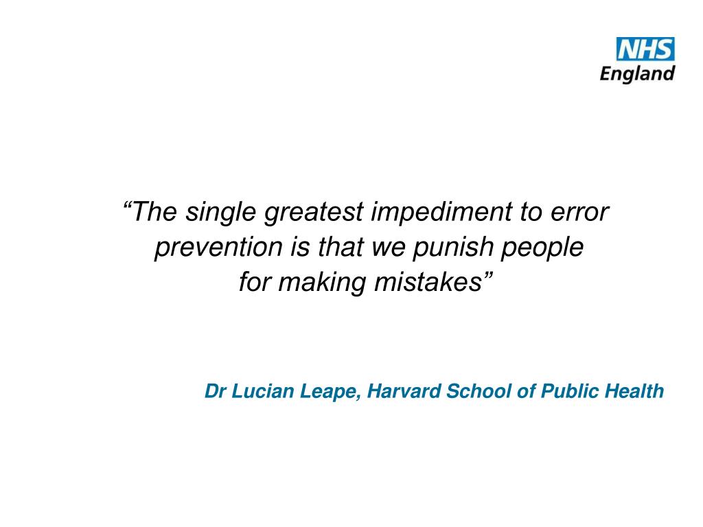 “The single greatest impediment to error prevention is that we punish people for making mistakes” Dr Lucian Leape, Harvard School of Public Health