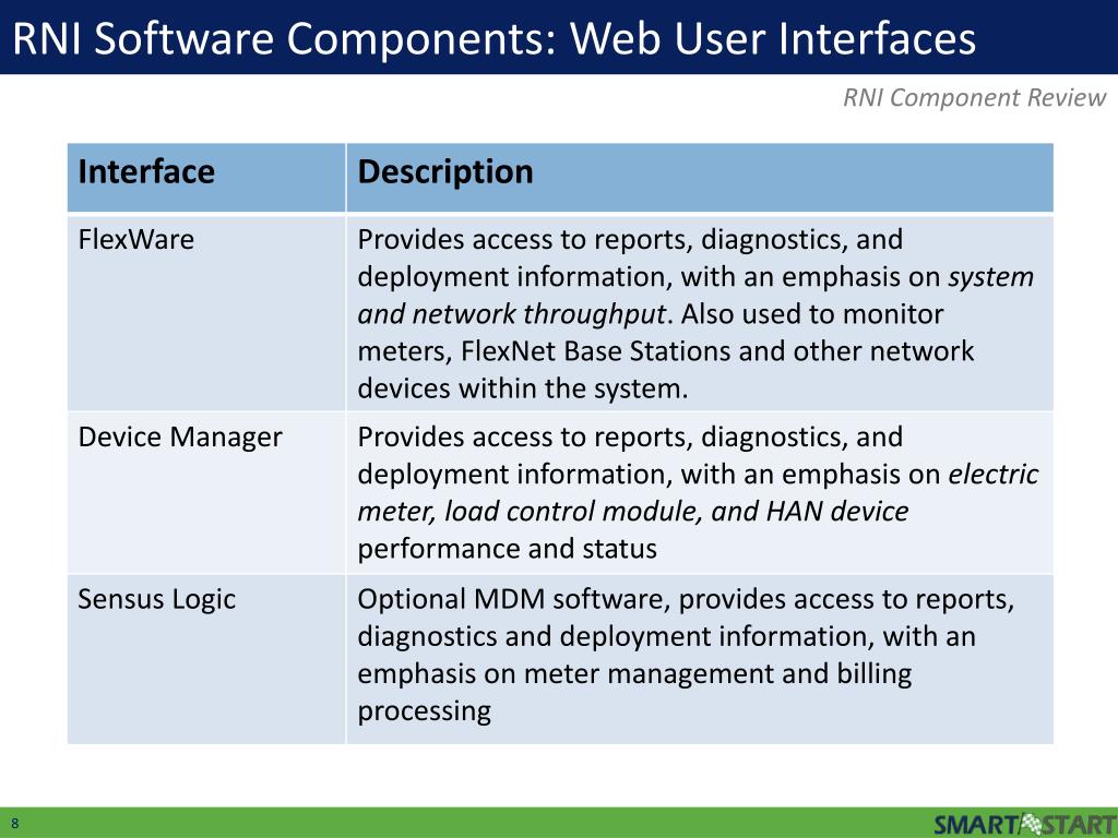 Describe the primary function of each of the software application servers. • Identify third-party software that the utility obtains and maintains. • State the purpose of the MultiSpeak interfaces in the RNI system. • Describe the type and format of reports available from the Reporting Component. • Describe the high-level flow of data through the RNI System. Module Objectives