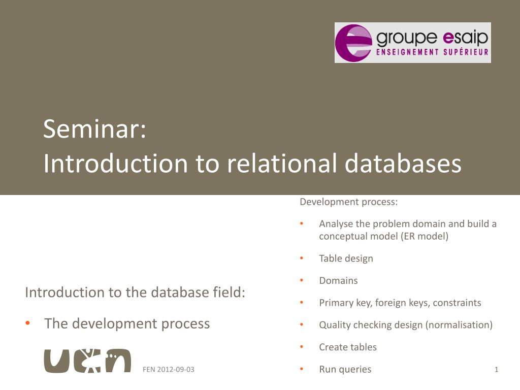 Seminar:Introduction to relational databases Development process: Analyse the problem domain and build a conceptual model (ER model) Table design Domains Primary key, foreign keys, constraints Quality checking design (normalisation) Create tables Run queries Introduction to the database field: The development process FEN 2012-09-03