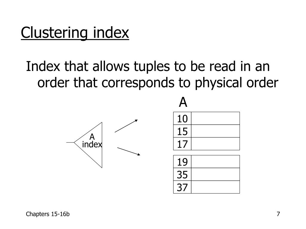 Clustering index Index that allows tuples to be read in an order that corresponds to physical order A 10 15 A index 17 19 35 37