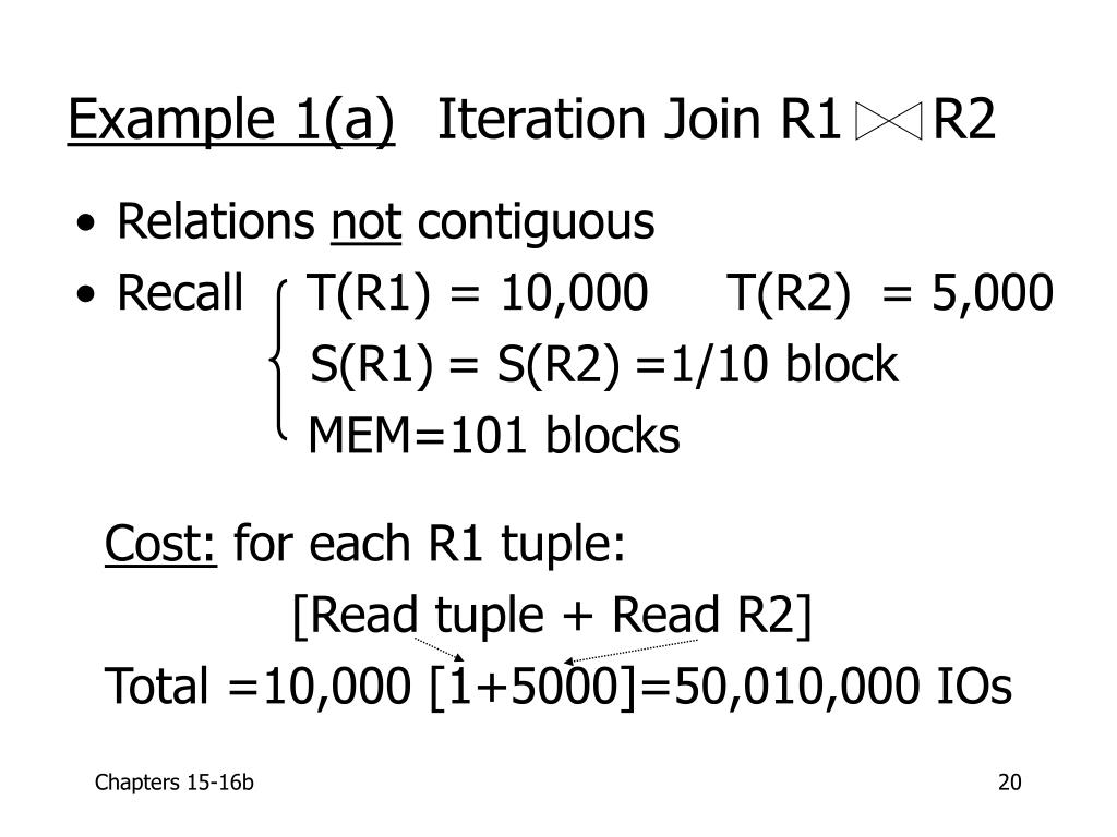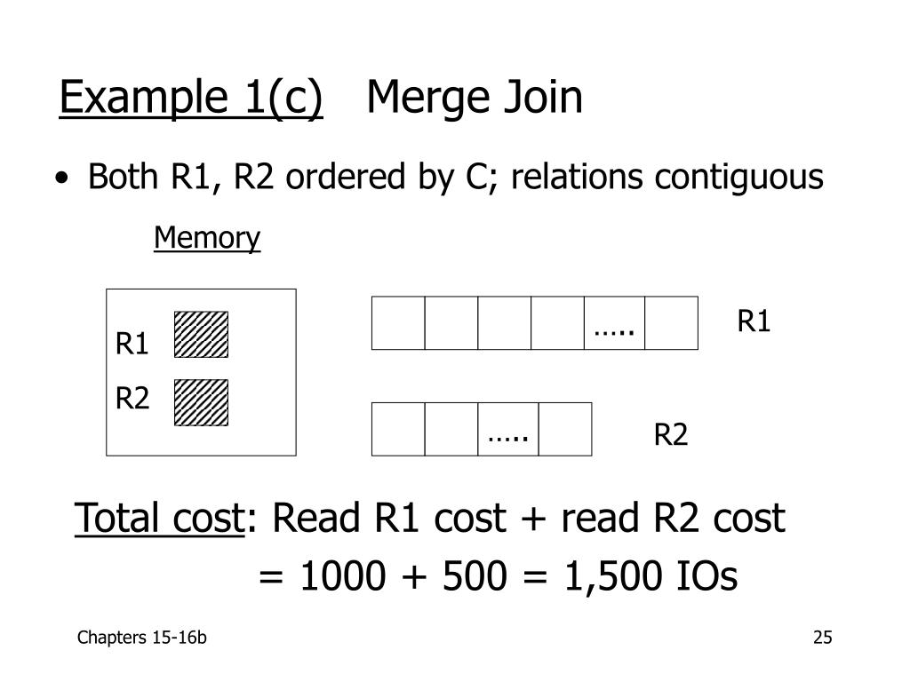 But say R1 = 10,000 blocks contiguous R2 = 5,000 blocks not ordered Iterate:5000 x (100+10,000) = 50 x 10,100 100 = 505,000 IOs Merge join: 5(10,000+5,000) = 75,000 IOs Merge Join (with sort) WINS!