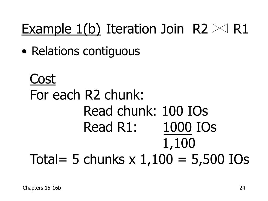 Cost For each R2 chunk: Read chunk: 100 IOs Read R1: 1000 IOs 1,100 Total= 5 chunks x 1,100 = 5,500 IOs Example 1(b) Iteration Join R2 R1 • Relations contiguous