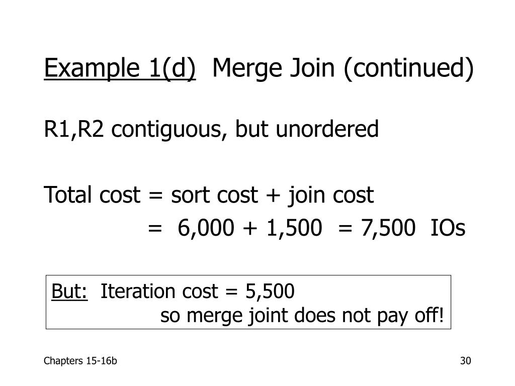 Example 1(d) Merge Join (continued) R1,R2 contiguous, but unordered Total cost = sort cost + join cost = 6,000 + 1,500 = 7,500 IOs But: Iteration cost = 5,500 so merge joint does not pay off!