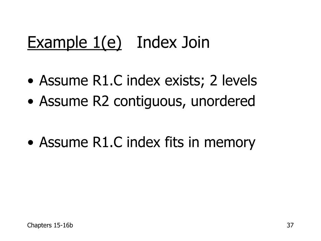 Example 1(e) Index Join • Assume R1.C index exists; 2 levels • Assume R2 contiguous, unordered • Assume R1.C index fits in memory
