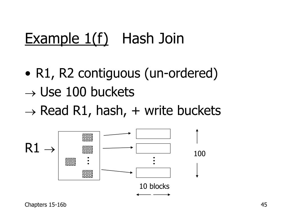 -> Same for R2 -> Read one R1 bucket; build memory hash table -> Read corresponding R2 bucket + hash probe R1 R2 ... R1 ... memory Then repeat for all buckets