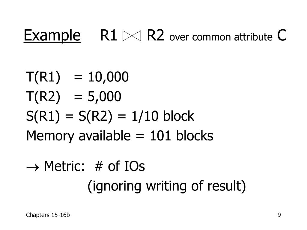 Example R1 R2 over common attribute C T(R1) = 10,000 T(R2) = 5,000 S(R1) = S(R2) = 1/10 block Memory available = 101 blocks Metric: # of IOs (ignoring writing of result)