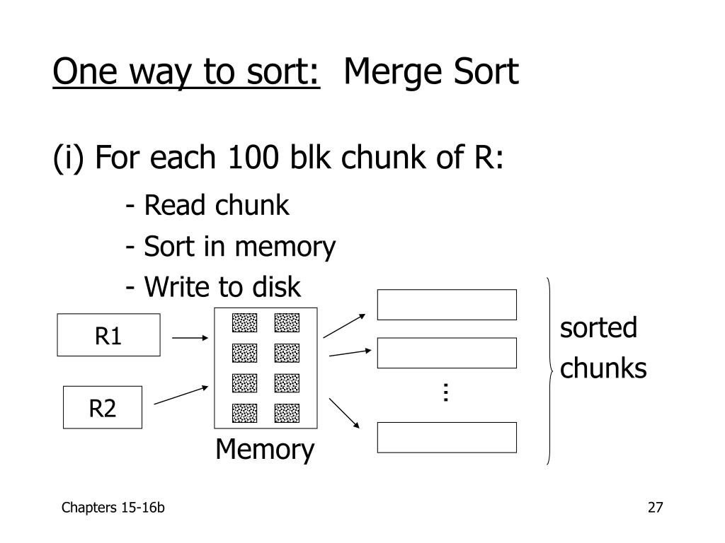One way to sort: Merge Sort (i) For each 100 blk chunk of R: - Read chunk - Sort in memory - Write to disk sorted chunks Memory R1 ... R2