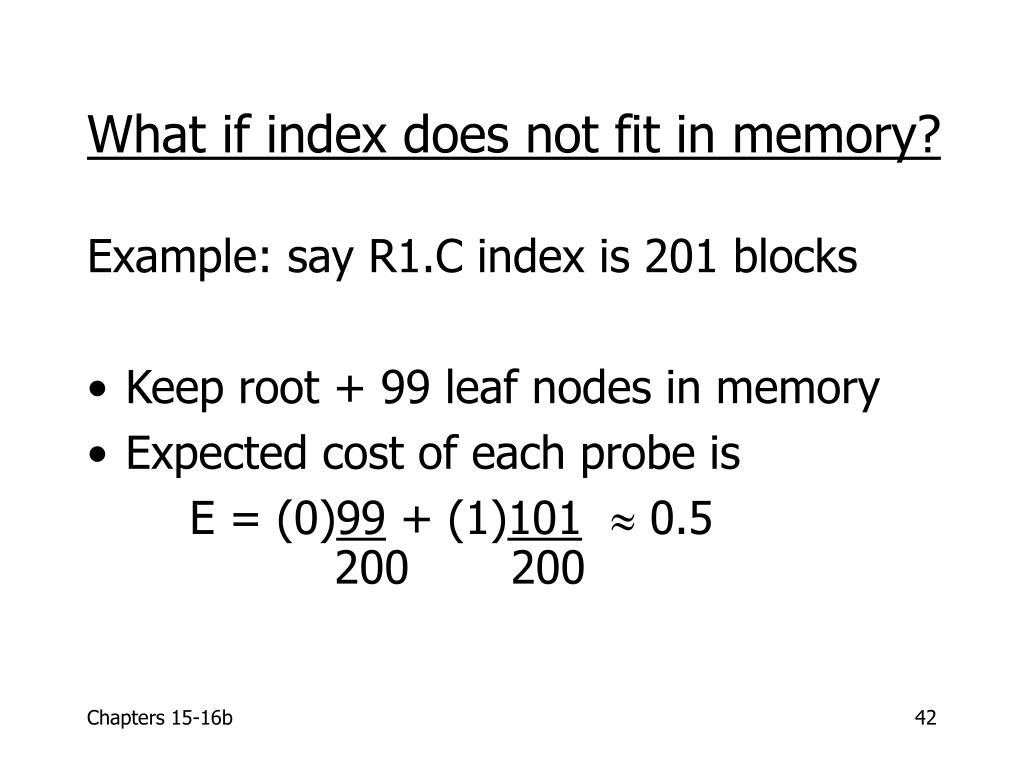 What if index does not fit in memory? Example: say R1.C index is 201 blocks • Keep root + 99 leaf nodes in memory • Expected cost of each probe is E = (0)99 + (1)101 0.5 200 200