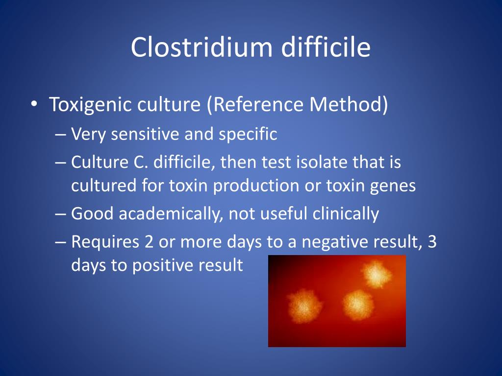 Clostridium difficile • Toxigenic culture (Reference Method) • Very sensitive and specific • Culture C. difficile, then test isolate that is cultured for toxin production or toxin genes • Good academically, not useful clinically • Requires 2 or more days to a negative result, 3 days to positive result