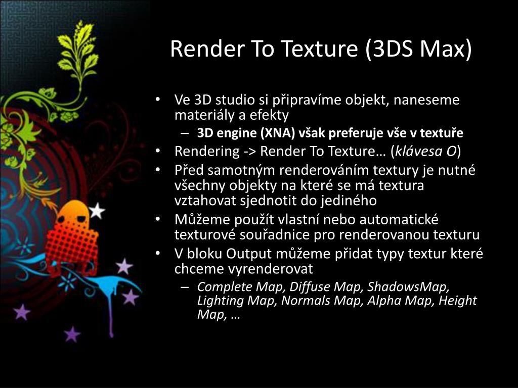 Render To Texture (3DS Max) • Ve 3D studio si připravíme objekt, naneseme materiály a efekty • 3D engine (XNA) však preferuje vše v textuře • Rendering-> Render To Texture… (klávesa O) • Před samotným renderováním textury je nutné všechny objekty na které se má textura vztahovat sjednotit do jediného • Můžeme použít vlastní nebo automatické texturové souřadnice pro renderovanou texturu • V bloku Output můžeme přidat typy textur které chceme vyrenderovat • Complete Map, Diffuse Map, ShadowsMap, Lighting Map, Normals Map, Alpha Map, Height Map, …