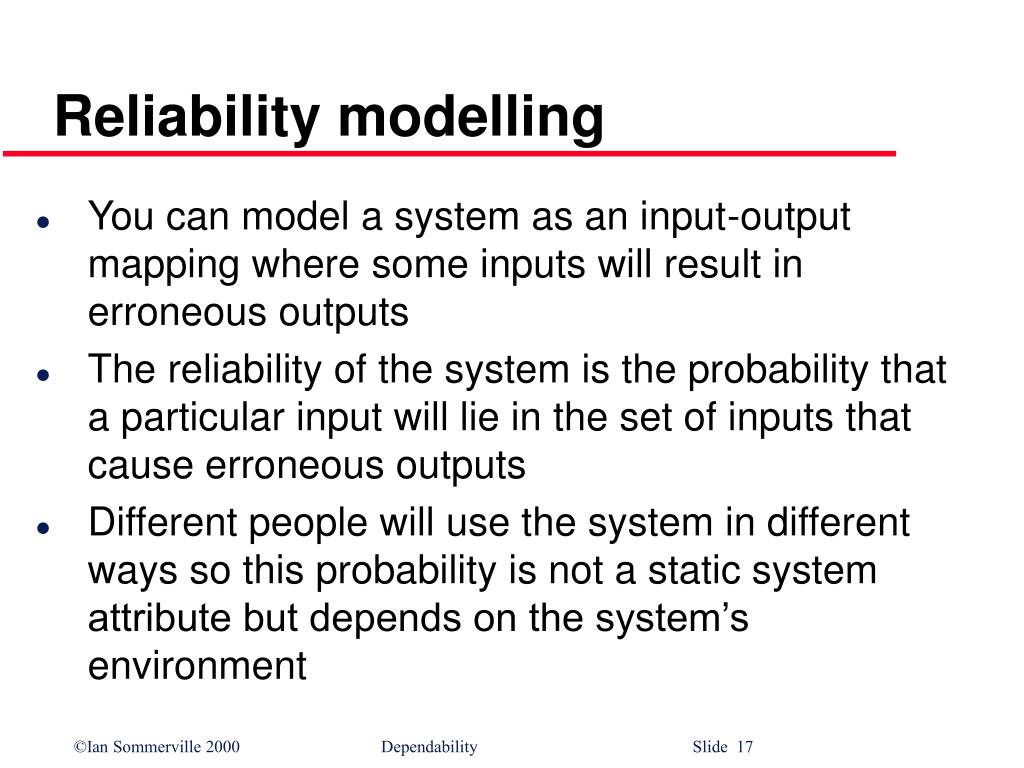 Reliability modelling • You can model a system as an input-output mapping where some inputs will result in erroneous outputs • The reliability of the system is the probability that a particular input will lie in the set of inputs that cause erroneous outputs • Different people will use the system in different ways so this probability is not a static system attribute but depends on the system’s environment