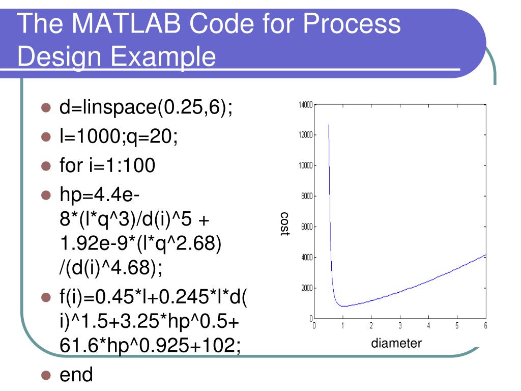The MATLAB Code for Process Design Example • d=linspace(0.25,6); • l=1000;q=20; • for i=1:100 • hp=4.4e-8*(l*q^3)/d(i)^5 + 1.92e-9*(l*q^2.68) /(d(i)^4.68); • f(i)=0.45*l+0.245*l*d(i)^1.5+3.25*hp^0.5+61.6*hp^0.925+102; • end cost diameter