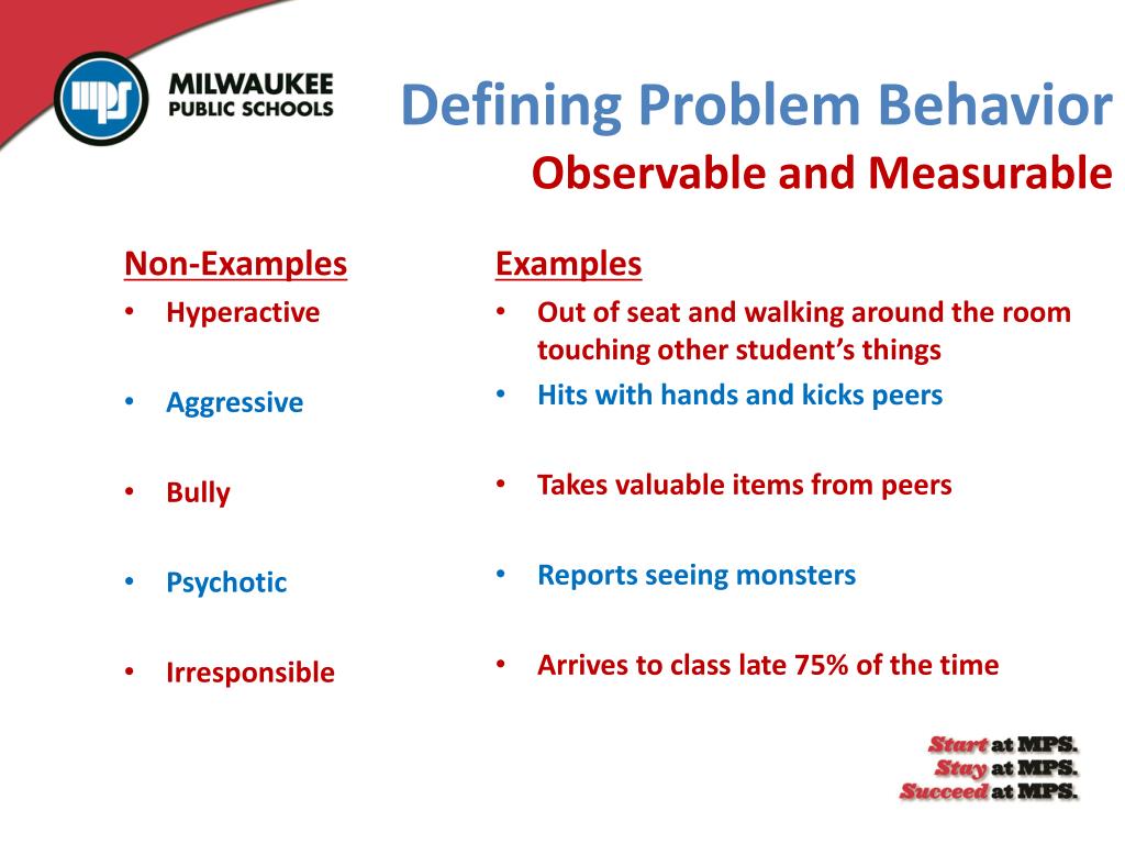 Defining Problem Behavior Observable and Measurable Non-Examples • Hyperactive • Aggressive • Bully • Psychotic • Irresponsible Examples • Out of seat and walking around the room touching other student’s things • Hits with hands and kicks peers • Takes valuable items from peers • Reports seeing monsters • Arrives to class late 75% of the time