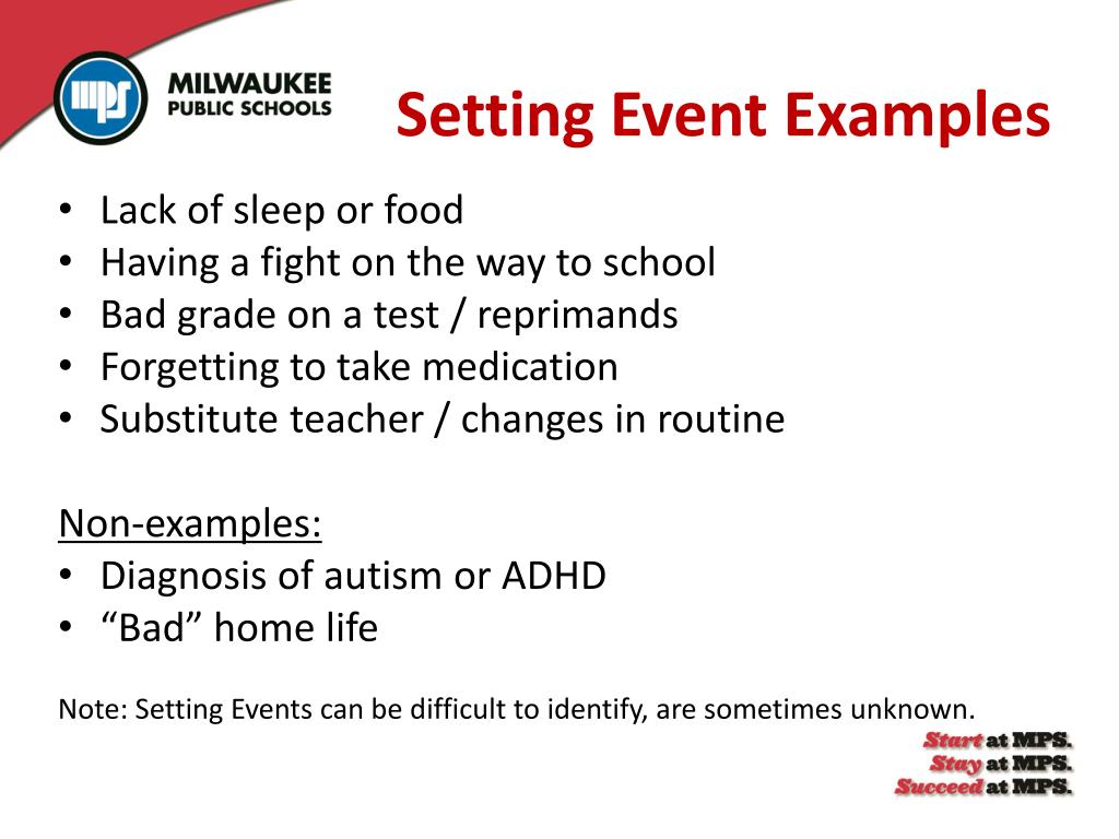 Setting Event Examples Lack of sleep or food Having a fight on the way to school Bad grade on a test / reprimands Forgetting to take medication Substitute teacher / changes in routine Non-examples: Diagnosis of autism or ADHD “Bad” home life Note: Setting Events can be difficult to identify, are sometimes unknown.