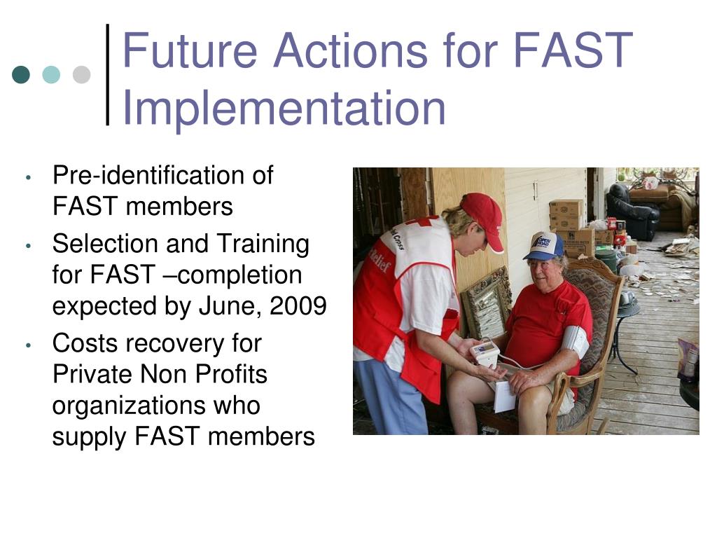 Future Actions for FAST Implementation • Pre-identification of FAST members • Selection and Training for FAST –completion expected by June, 2009 • Costs recovery for Private Non Profits organizations who supply FAST members