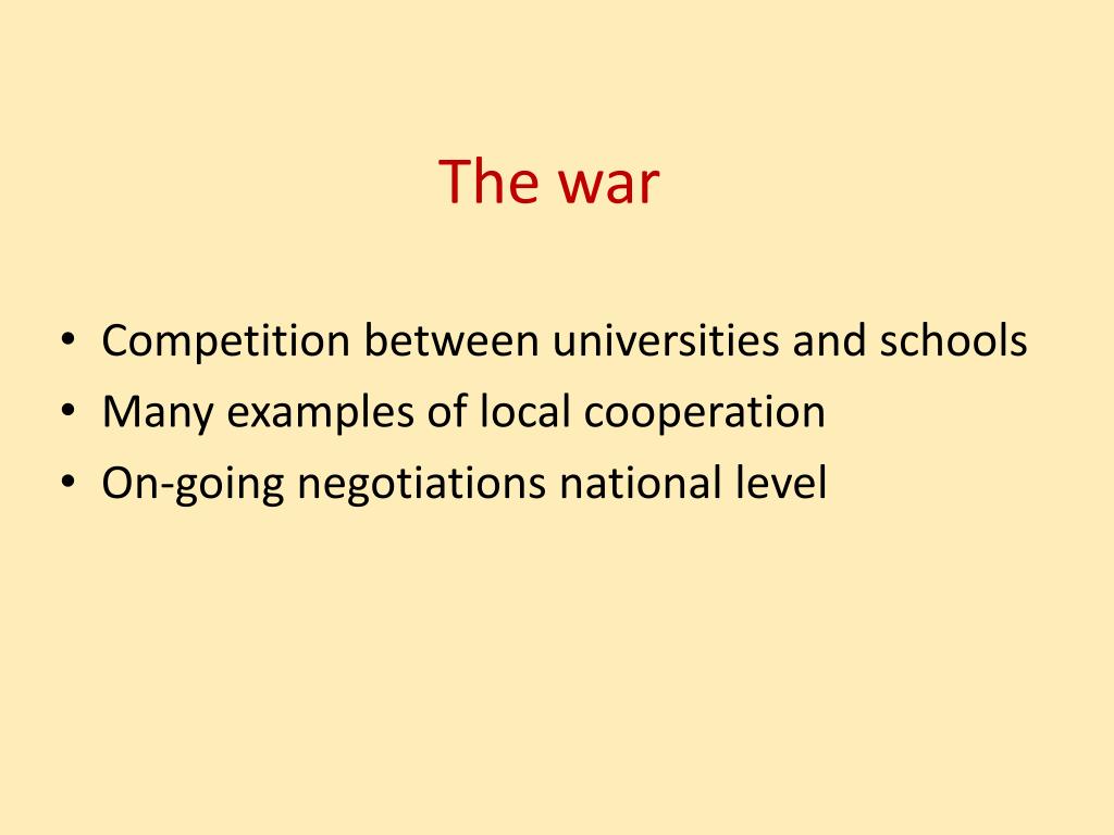 The war • Competition between universities and schools • Many examples of local cooperation • On-going negotiations national level