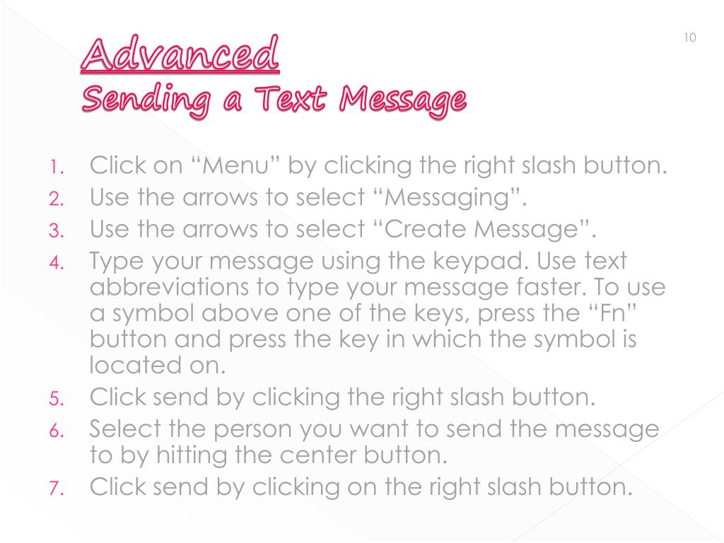 AdvancedSending a Text Message • Click on “Menu” by clicking the right slash button. • Use the arrows to select “Messaging”. • Use the arrows to select “Create Message”. • Type your message using the keypad. Use text abbreviations to type your message faster. To use a symbol above one of the keys, press the “Fn” button and press the key in which the symbol is located on. • Click send by clicking the right slash button. • Select the person you want to send the message to by hitting the center button. • Click send by clicking on the right slash button.