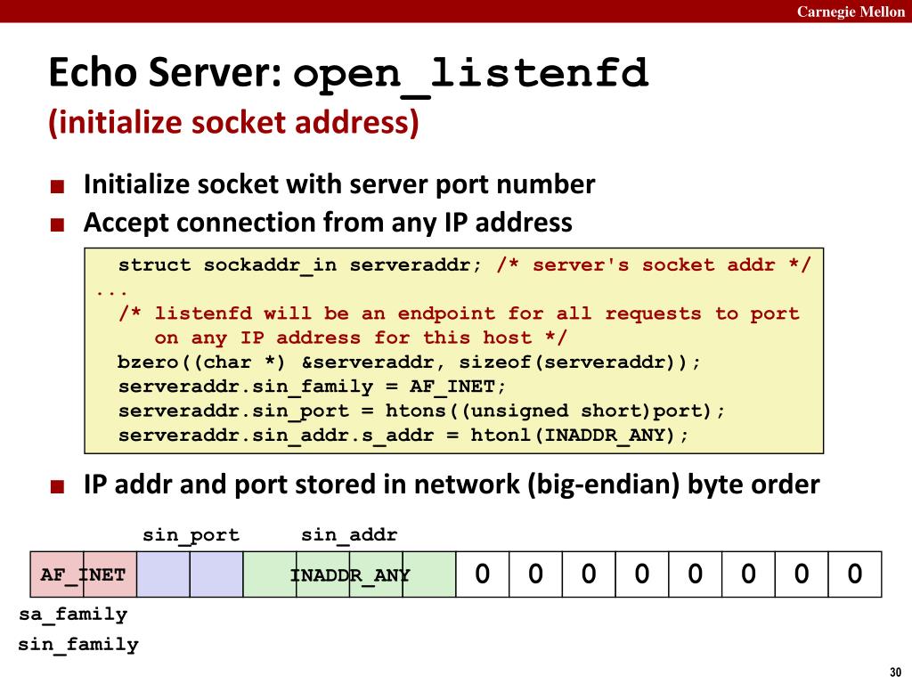 Echo Server: open_listenfd(cont.) ... /* Listenfd will be an endpoint for all requests to port on any IP address for this host */ bzero((char *) &serveraddr, sizeof(serveraddr)); serveraddr.sin_family = AF_INET; serveraddr.sin_addr.s_addr = htonl(INADDR_ANY); serveraddr.sin_port = htons((unsigned short)port); if (bind(listenfd, (SA *)&serveraddr, sizeof(serveraddr)) < 0) return -1; /* Make it a listening socket ready to accept connection requests */ if (listen(listenfd, LISTENQ) < 0) return -1; return listenfd; }