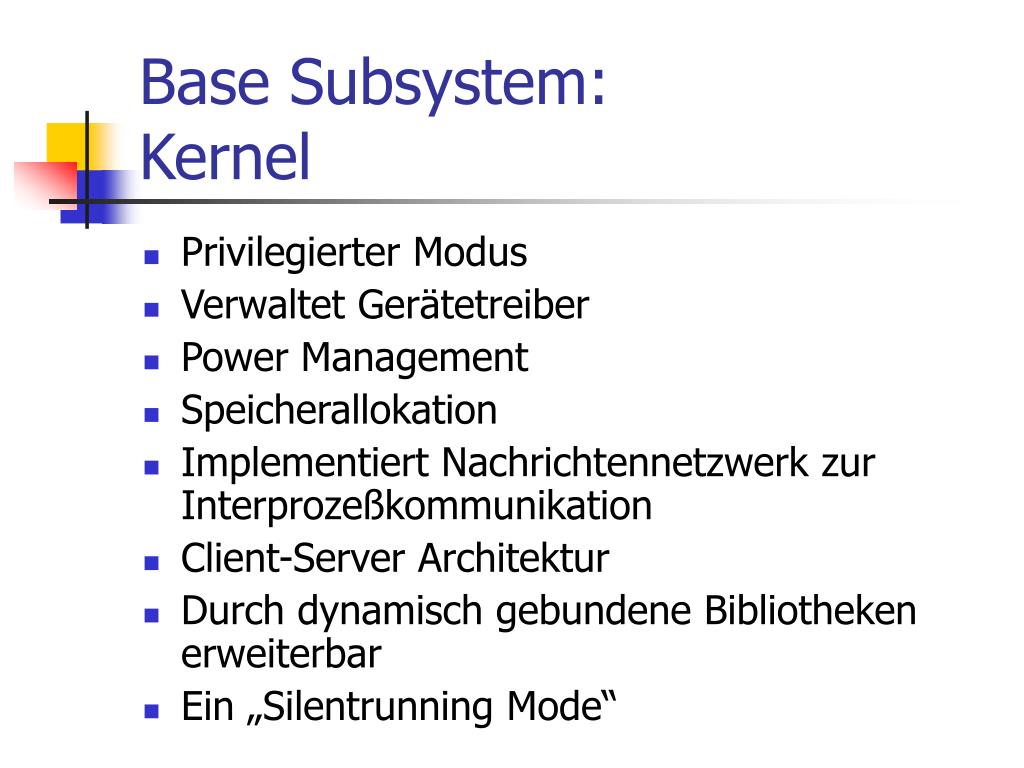 Base Subsystem:Kernel • Privilegierter Modus • Verwaltet Gerätetreiber • Power Management • Speicherallokation • Implementiert Nachrichtennetzwerk zur Interprozeßkommunikation • Client-Server Architektur • Durch dynamisch gebundene Bibliotheken erweiterbar • Ein „Silentrunning Mode“