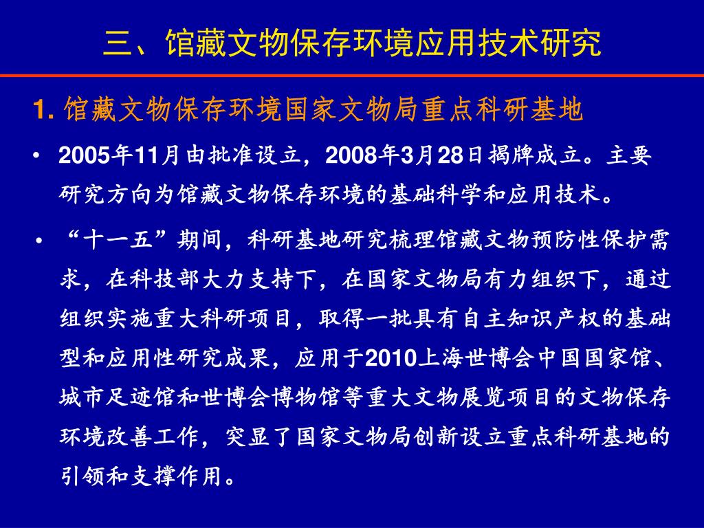 三、馆藏文物保存环境应用技术研究 1. 馆藏文物保存环境国家文物局重点科研基地 • 2005年11月由批准设立,2008年3月28日揭牌成立。主要研究方向为馆藏文物保存环境的基础科学和应用技术。 • “十一五”期间,科研基地研究梳理馆藏文物预防性保护需求,在科技部大力支持下,在国家文物局有力组织下,通过组织实施重大科研项目,取得一批具有自主知识产权的基础型和应用性研究成果,应用于2010上海世博会中国国家馆、城市足迹馆和世博会博物馆等重大文物展览项目的文物保存环境改善工作,突显了国家文物局创新设立重点科研基地的引领和支撑作用。