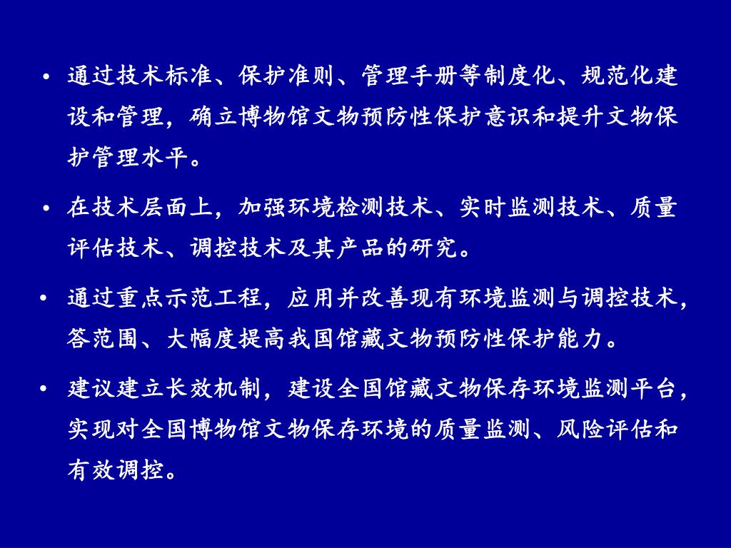 通过技术标准、保护准则、管理手册等制度化、规范化建设和管理,确立博物馆文物预防性保护意识和提升文物保护管理水平。通过技术标准、保护准则、管理手册等制度化、规范化建设和管理,确立博物馆文物预防性保护意识和提升文物保护管理水平。 • 在技术层面上,加强环境检测技术、实时监测技术、质量评估技术、调控技术及其产品的研究。 • 通过重点示范工程,应用并改善现有环境监测与调控技术,答范围、大幅度提高我国馆藏文物预防性保护能力。 • 建议建立长效机制,建设全国馆藏文物保存环境监测平台,实现对全国博物馆文物保存环境的质量监测、风险评估和有效调控。