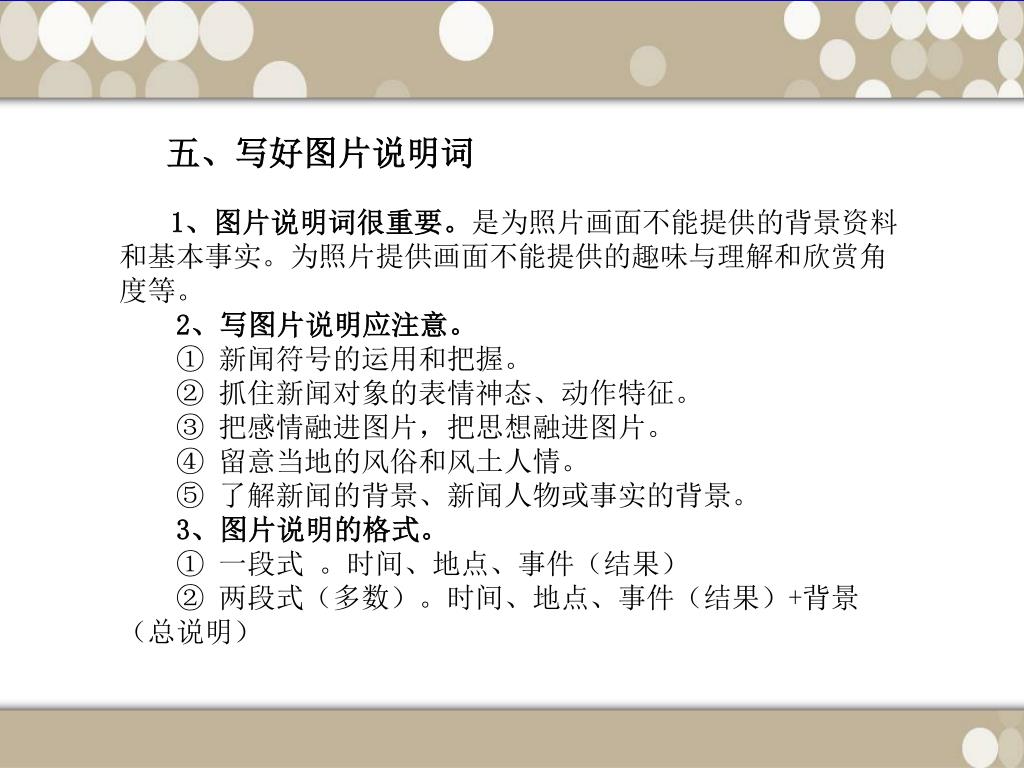 五、写好图片说明词 1、图片说明词很重要。是为照片画面不能提供的背景资料和基本事实。为照片提供画面不能提供的趣味与理解和欣赏角度等。 2、写图片说明应注意。 ① 新闻符号的运用和把握。 ② 抓住新闻对象的表情神态、动作特征。 ③ 把感情融进图片,把思想融进图片。 ④ 留意当地的风俗和风土人情。 ⑤ 了解新闻的背景、新闻人物或事实的背景。 3、图片说明的格式。 ① 一段式 。时间、地点、事件(结果) ② 两段式(多数)。时间、地点、事件(结果)+背景(总说明)