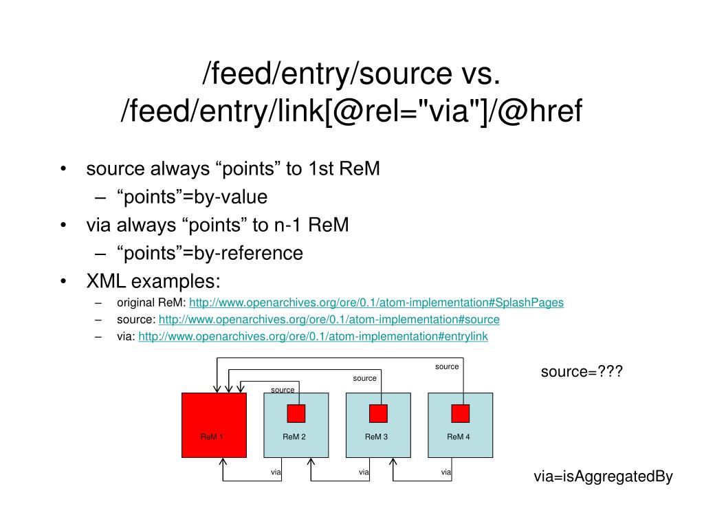 source source=??? source source ReM 1 ReM 2 ReM 3 ReM 4 via=isAggregatedBy via via via /feed/entry/source vs. /feed/entry/link[@rel="via"]/@href • source always “points” to 1st ReM • “points”=by-value • via always “points” to n-1 ReM • “points”=by-reference • XML examples: • original ReM: http://www.openarchives.org/ore/0.1/atom-implementation#SplashPages • source: http://www.openarchives.org/ore/0.1/atom-implementation#source • via: http://www.openarchives.org/ore/0.1/atom-implementation#entrylink