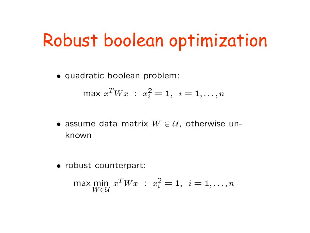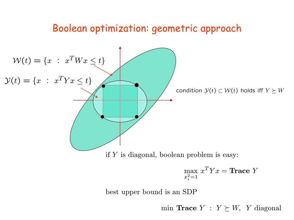 SDP for boolean / nonconvex optimization • geometric and algebraic approaches are dual (see later), yield the same upper bound • SDP provides upper bound • may recover primal variable by sampling • approach extends to many problems • eg, problems with (nonconvex) quadratic constraints & objective • in some cases, quality of relaxation is provably good