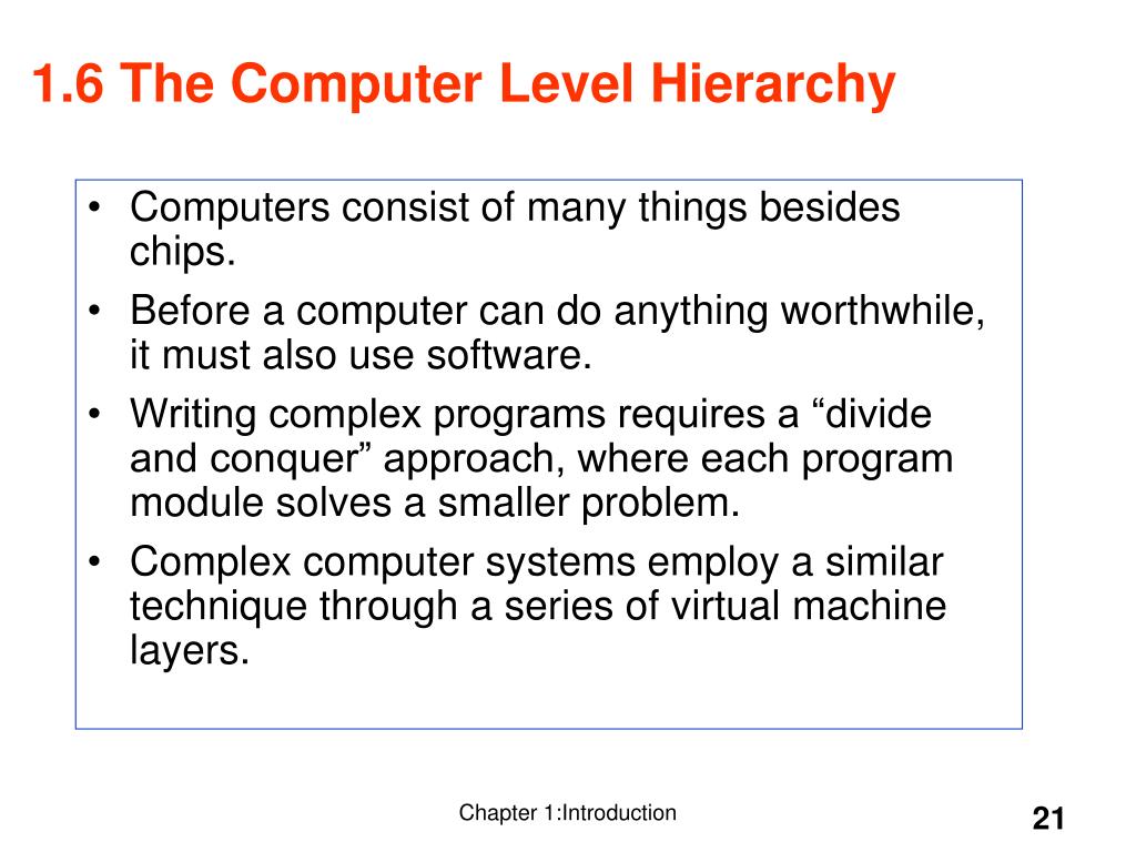 Computers consist of many things besides chips. Before a computer can do anything worthwhile, it must also use software. Writing complex programs requires a “divide and conquer” approach, where each program module solves a smaller problem. Complex computer systems employ a similar technique through a series of virtual machine layers. 1.6 The Computer Level Hierarchy Chapter 1:Introduction