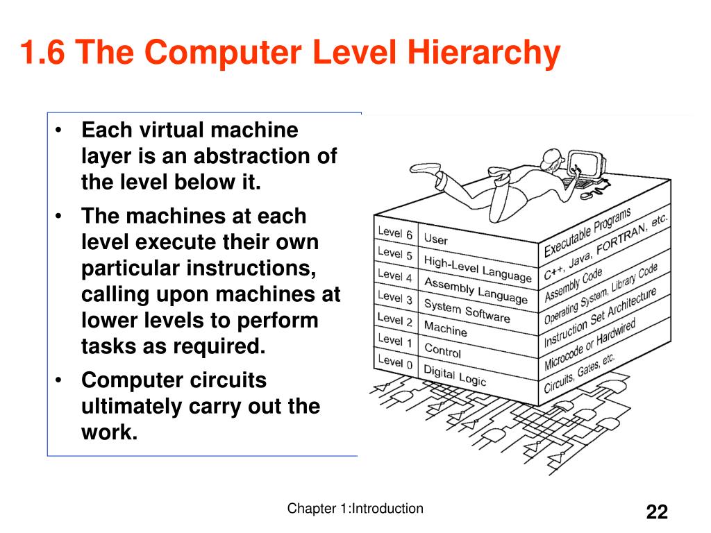 Each virtual machine layer is an abstraction of the level below it. The machines at each level execute their own particular instructions, calling upon machines at lower levels to perform tasks as required. Computer circuits ultimately carry out the work. 1.6 The Computer Level Hierarchy Chapter 1:Introduction