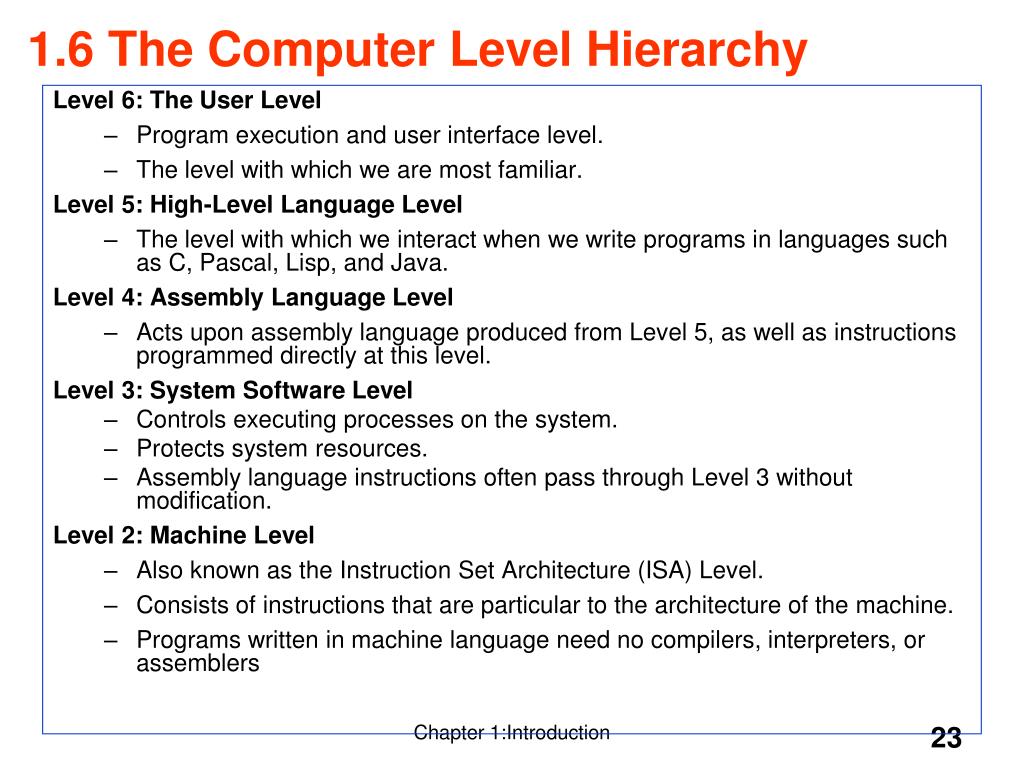 Level 6: The User Level Program execution and user interface level. The level with which we are most familiar. Level 5: High-Level Language Level The level with which we interact when we write programs in languages such as C, Pascal, Lisp, and Java. Level 4: Assembly Language Level Acts upon assembly language produced from Level 5, as well as instructions programmed directly at this level. Level 3: System Software Level Controls executing processes on the system. Protects system resources. Assembly language instructions often pass through Level 3 without modification. Level 2: Machine Level Also known as the Instruction Set Architecture (ISA) Level. Consists of instructions that are particular to the architecture of the machine. Programs written in machine language need no compilers, interpreters, or assemblers 1.6 The Computer Level Hierarchy Chapter 1:Introduction