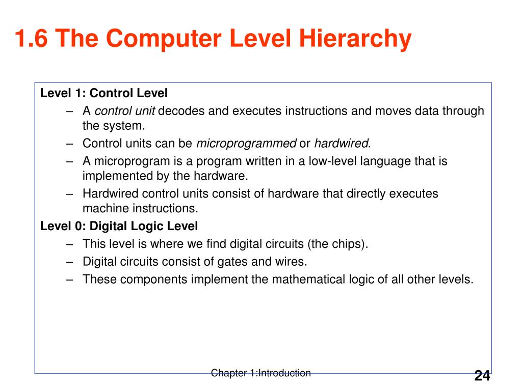 Level 1: Control Level A control unit decodes and executes instructions and moves data through the system. Control units can be microprogrammed or hardwired. A microprogram is a program written in a low-level language that is implemented by the hardware. Hardwired control units consist of hardware that directly executes machine instructions. Level 0: Digital Logic Level This level is where we find digital circuits (the chips). Digital circuits consist of gates and wires. These components implement the mathematical logic of all other levels. 1.6 The Computer Level Hierarchy Chapter 1:Introduction