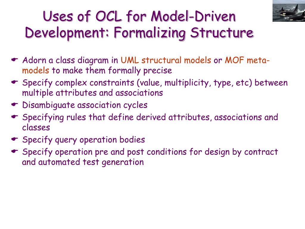 Uses of OCL for Model-Driven Development: Formalizing Structure • Adorn a class diagram in UML structural models or MOF meta-models to make them formally precise • Specify complex constraints (value, multiplicity, type, etc) between multiple attributes and associations • Disambiguate association cycles • Specifying rules that define derived attributes, associations and classes • Specify query operation bodies • Specify operation pre and post conditions for design by contract and automated test generation